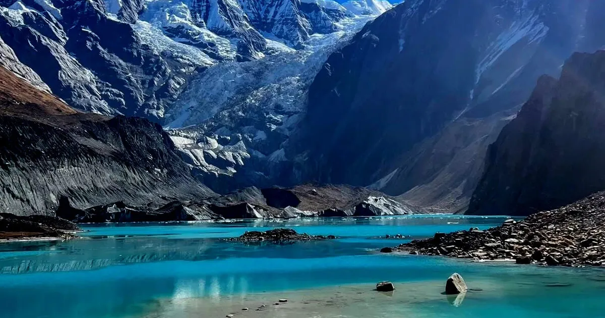 Reaching Kapuche Lake was emotional. It is one of the lowest altitude glacial lakes in Nepal, but it feels high and raw. The lake appeared suddenly between steep walls of rock and ice. The water was still and deep blue. Annapurna II and Lamjung Himal rose straight behind it.